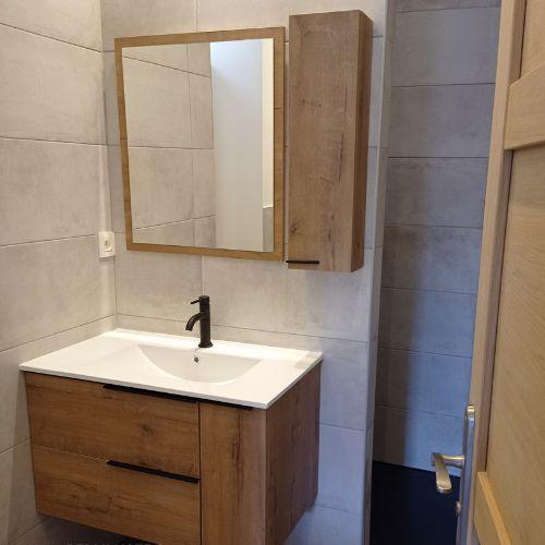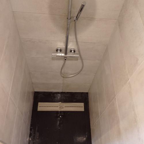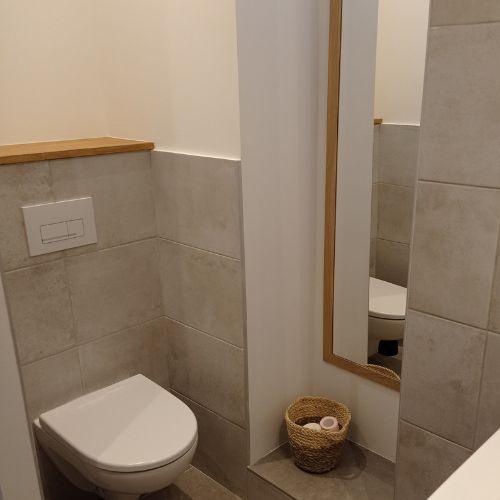 - une salle de bain avec une douche italienne et une pièce de vie sur une cuisine ouverte.